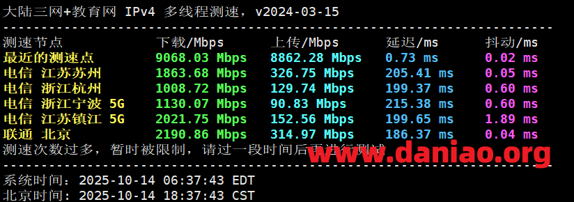 --------------------自动更新测速节点列表------------------- 位置 上传速度 下载速度 延迟 Speedtest.net 3117.27Mbps 1274.92Mbps 1.14ms 法兰克福 767.08Mbps 1527.01Mbps 7.78ms 洛杉矶 36.84Mbps 13.92Mbps 150.46ms 联通上海5G 21.55Mbps 64.37Mbps 237.08ms 电信Suzhou5G 27.19Mbps 19.11Mbps 197.50ms 移动Suzhou 12.44Mbps 0.07Mbps 327.39ms