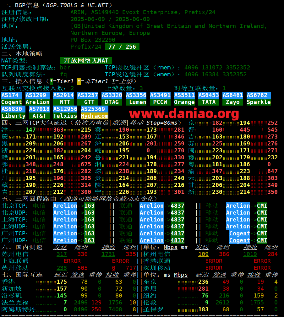 五、三网回程路由(线路可能随网络负载动态变化) 北京TCP:电信 Arelion->163 || 联通 Arelion->4837 || 移动 Arelion->CMI 北京UDP:电信 Arelion->163 || 联通 Arelion->4837 || 移动 Arelion->CMI 上海TCP:电信 Arelion->163 || 联通 Arelion->4837 || 移动 Arelion->CMI 上海UDP:电信 Arelion->163 || 联通 Arelion->4837 || 移动 Arelion->CMI 广州TCP:电信 Arelion->163 || 联通 Arelion->4837 || 移动 Cogent->CMI 广州UDP:电信 Arelion->163 || 联通 Arelion->4837 || 移动 Cogent->CMI