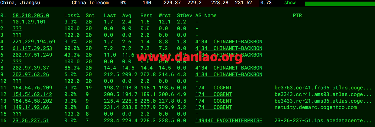 北京电信 NextTrace v1.4.2 2025-07-26T12:51:39Z cefed2a [NextTrace API] preferred API IP - 104.26.12.151 - 76.74ms - Misaka.BER IP Geo Data Provider: LeoMoeAPI traceroute to 219.141.147.210, 30 hops max, 52 bytes payload, ICMP mode 1 23.26.237.1 AS137409 美国 伊利诺伊州 芝加哥 globalsecurelayer.com 0.34 ms / 0.40 ms / 0.45 ms 2 192.168.40.1 * RFC1918 0.48 ms / 0.52 ms / 0.54 ms 3 * 4 62.115.43.133 AS1299 [ARELION-NET] 瑞典 斯德哥尔摩省 斯德哥尔摩 arelion.com 1.60 ms / 1.32 ms / 1.44 ms 5 202.97.83.225 AS4134 [CHINANET-BB] 中国 北京 www.chinatelecom.com.cn 电信 138.44 ms / * ms / * ms 6 * 7 * 8 * 9 106.120.254.2 AS4847 [CHINANET-GD] 中国 北京 chinatelecom.cn 131.78 ms / 130.98 ms / 132.18 ms 10 219.141.147.210 AS4847 [CHINATELECOM-BJ] 中国 北京 chinatelecom.cn 133.09 ms / 133.02 ms / 133.02 ms ---------------------------------------------------------------------- 上海电信 NextTrace v1.4.2 2025-07-26T12:51:39Z cefed2a [NextTrace API] preferred API IP - 104.26.13.151 - 75.55ms - Misaka.BER IP Geo Data Provider: LeoMoeAPI traceroute to 202.96.209.133, 30 hops max, 52 bytes payload, ICMP mode 1 23.26.237.1 AS137409 美国 伊利诺伊州 芝加哥 globalsecurelayer.com 0.35 ms / 0.45 ms / 0.34 ms 2 192.168.40.1 * RFC1918 0.52 ms / 0.44 ms / 0.50 ms 3 * 4 62.115.43.133 AS1299 [ARELION-NET] 瑞典 斯德哥尔摩省 斯德哥尔摩 arelion.com chinatelecom-ic-386087.ip.twelve99-cust.net 1.30 ms / 2.61 ms / 2.93 ms 5 202.97.83.145 AS4134 [CHINANET-BB] 中国 上海 www.chinatelecom.com.cn 190.91 ms / 190.62 ms / 190.64 ms 6 202.97.51.242 AS4134 [CHINANET-BB] 中国 上海 I-C www.chinatelecom.com.cn 电信 249.74 ms / 249.03 ms / * ms 7 202.97.57.26 AS4134 [CHINANET-BB] 中国 上海 www.chinatelecom.com.cn 电信 229.58 ms / 227.50 ms / * ms 8 61.152.25.157 AS4812 [CHINANET-SH] 中国 上海 chinatelecom.cn 电信 260.86 ms / * ms / * ms 9 61.152.51.142 AS4812 [CHINANET-SH] 中国 上海 闵行 chinatelecom.cn 194.93 ms / 194.82 ms / 192.73 ms 10 202.96.209.133 AS4812 [CHINANET-SH] 中国 上海 chinatelecom.cn 电信 221.67 ms / 221.38 ms / 222.53 ms ---------------------------------------------------------------------- 深圳电信 NextTrace v1.4.2 2025-07-26T12:51:39Z cefed2a [NextTrace API] preferred API IP - [2606:4700:20::ac43:45a3] - 43.65ms - Misaka.BER IP Geo Data Provider: LeoMoeAPI traceroute to 58.60.188.222, 30 hops max, 52 bytes payload, ICMP mode 1 23.26.237.1 AS137409 美国 伊利诺伊州 芝加哥 globalsecurelayer.com 23-26-237-1.ips.acedatacenter.com 0.52 ms / 0.37 ms / 0.60 ms 2 192.168.40.1 * RFC1918 0.58 ms / 0.71 ms / 27.94 ms 3 * 4 62.115.43.133 AS1299 [ARELION-NET] 瑞典 斯德哥尔摩省 斯德哥尔摩 arelion.com chinatelecom-ic-386087.ip.twelve99-cust.net 1.39 ms / 13.25 ms / 2.02 ms 5 202.97.58.13 AS4134 [CHINANET-BB] 中国 广东 广州 www.chinatelecom.com.cn 电信 204.75 ms / 204.76 ms / 204.92 ms 6 202.97.12.38 AS4134 [CHINANET-BB] 中国 广东 广州 www.chinatelecom.com.cn 电信 208.86 ms / 208.93 ms / 208.76 ms 7 * 8 * 9 * 10 * 11 * 12 * 13 * 14 * 15 * 16 * 17 * 18 * 19 * 20 * 21 * 22 * 23 * 24 * 25 * 26 * 27 * 28 * 29 * 30 *