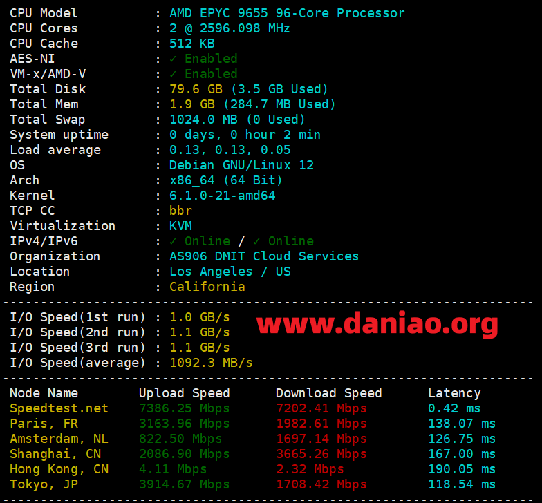CPU:AMD EPYC 9005(AMD EPYC 9655 96-Core Processor),归属地美国洛杉矶,支持ipv6,磁盘IO当前测试为1092.3 MB/s