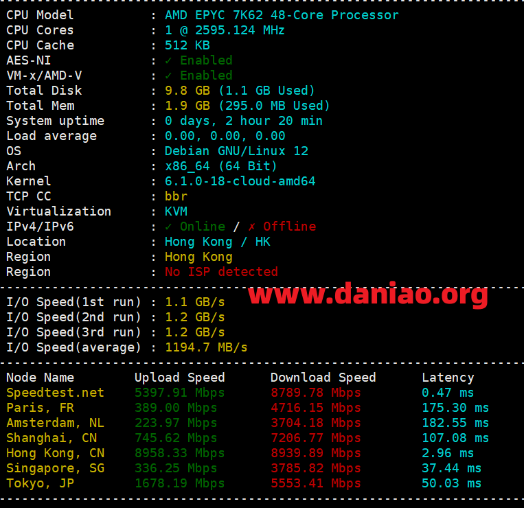 CPU EPYC 7002系列,硬盘IO目前测试倒是很优秀大致1194.7 MB/s,国际带宽很足,10G口应该差不多~