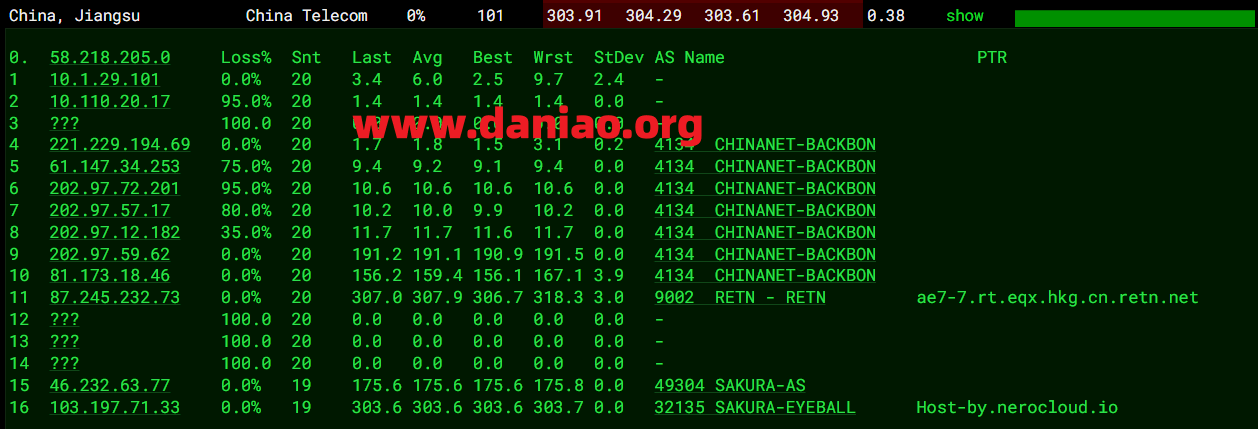 13  202.96.209.133  AS4812   [CHINANET-SH]    中国 上海   chinatelecom.cn  电信
