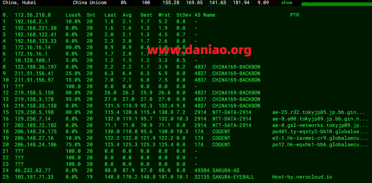 联通去程:联通骨干绕日本走ntt之后接驳cogent直连香港~
